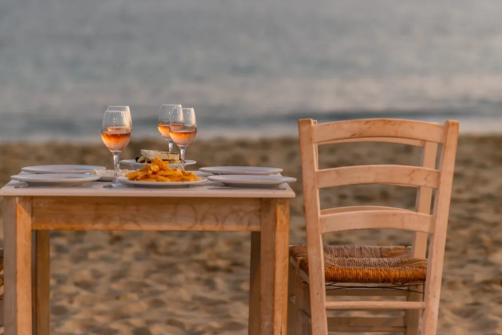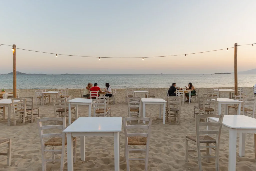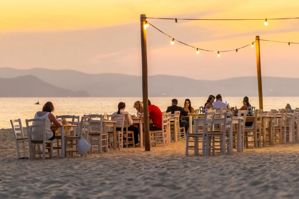 Experience authentic Greek cuisine at our seaside restaurant, where you can savor breakfast, lunch, or dinner while enjoying breathtaking views of the endless blue sea from tables nestled on the sandy beach, complemented by discreet lighting during the afternoon and evening.
